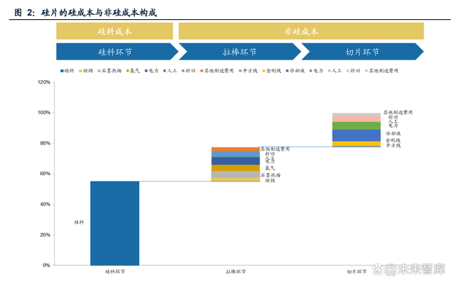 金剛線在光伏產業鏈中作為硅片生產的輔材,位于產業鏈上游,其技術性能直接影 響硅片的質量及光伏組件的制造成本,是光伏企業降本的核心技術環節。 單晶硅片的成本主要包括三個部分:(1)硅料環節:主要為硅料采購成本(55%); (2)拉棒環節:主要包括耗材(坩堝、熱場系統、氬氣等,占比合計10.8%)、電 力(4.95%)、設備折舊(3.6%)以及其他成本(2.7%);(3)切片環節:主要包 括耗材(開方線、金剛線、切割液等,占比合計11.5%)、電力(4.95%)、設備折 舊(3.6%)、人工以及其他成本(1.8%)。
