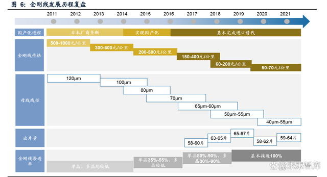 細線化是金剛線的長期發展趨勢。金剛線在光伏切片應用領域經歷了10年發展歷程, 目前在單晶切片和多晶切片的滲透率都達到了100%。金剛線滲透率提升的動力主要 來自兩個方面:一是國產化和規模化生產所帶來的價格快速下降,使得金剛線得以 大規模運用推廣;二是細線化帶來的出片量提升,從而降低單片硅耗,導致下游需 求快速增長。隨著硅料價格高企、硅片向大尺寸化和薄片化演進,細線化已成為金 剛線未來的長期發展趨勢。