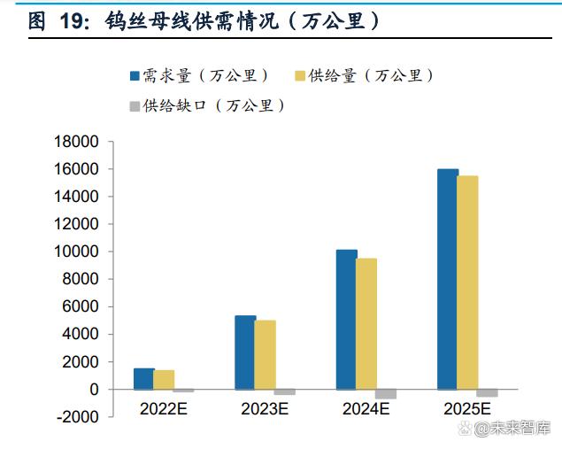 測算結果顯示,2022-2025年金剛線需求量可達到1.47/1.77/2.02/2.28億公里,市場 空間57/62/64/65億元;對應的鎢絲母線需求量為0.15/0.53/1.00/1.59億公里,市場空 間5.29/17.16/29.39/41.83億元,增速顯著超過金剛線,需求較為旺盛。由于兩大鎢 絲龍頭產能釋放需要一定周期,預計市場將出現供給缺口。