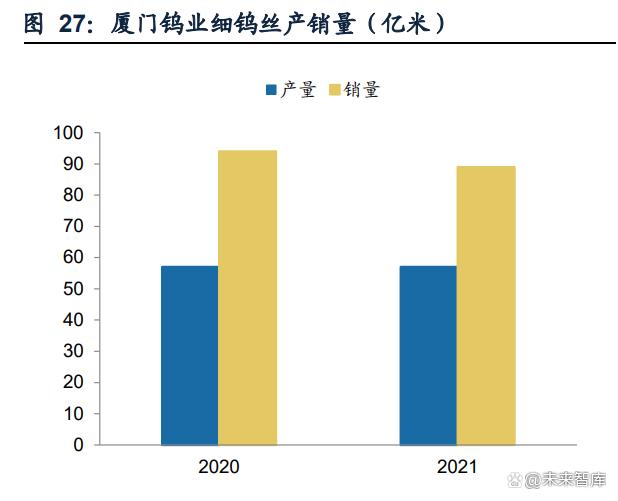 鎢絲擴產激進,毛利率較高。公司當前光伏用細鎢絲擴產項目規劃的產能共計845億 米/年,總投資11.36億元。當前公司月產能10億米上下,預計2022H2、2022年底、 2023H2將分別新增投產45億米、200億米、600億米的年產能。根據公司年報披露, 21年公司細鎢絲產量約57億米,銷量約89億米;細鎢絲收入約2億元(包括光伏用鎢 絲,但是具體比例公司未披露,結合實際情況,估計光伏用鎢絲占比較小),毛利率高達39%。